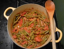 This is tasty and remarkably easy. I’ve made it twice in the new year. Thanks, mom. Green beans (one pound? six handfuls? It doesn’t really matter.) 1 or 2 yellow onions 1 28 ounce can whole peeled tomatoes 1/2 to