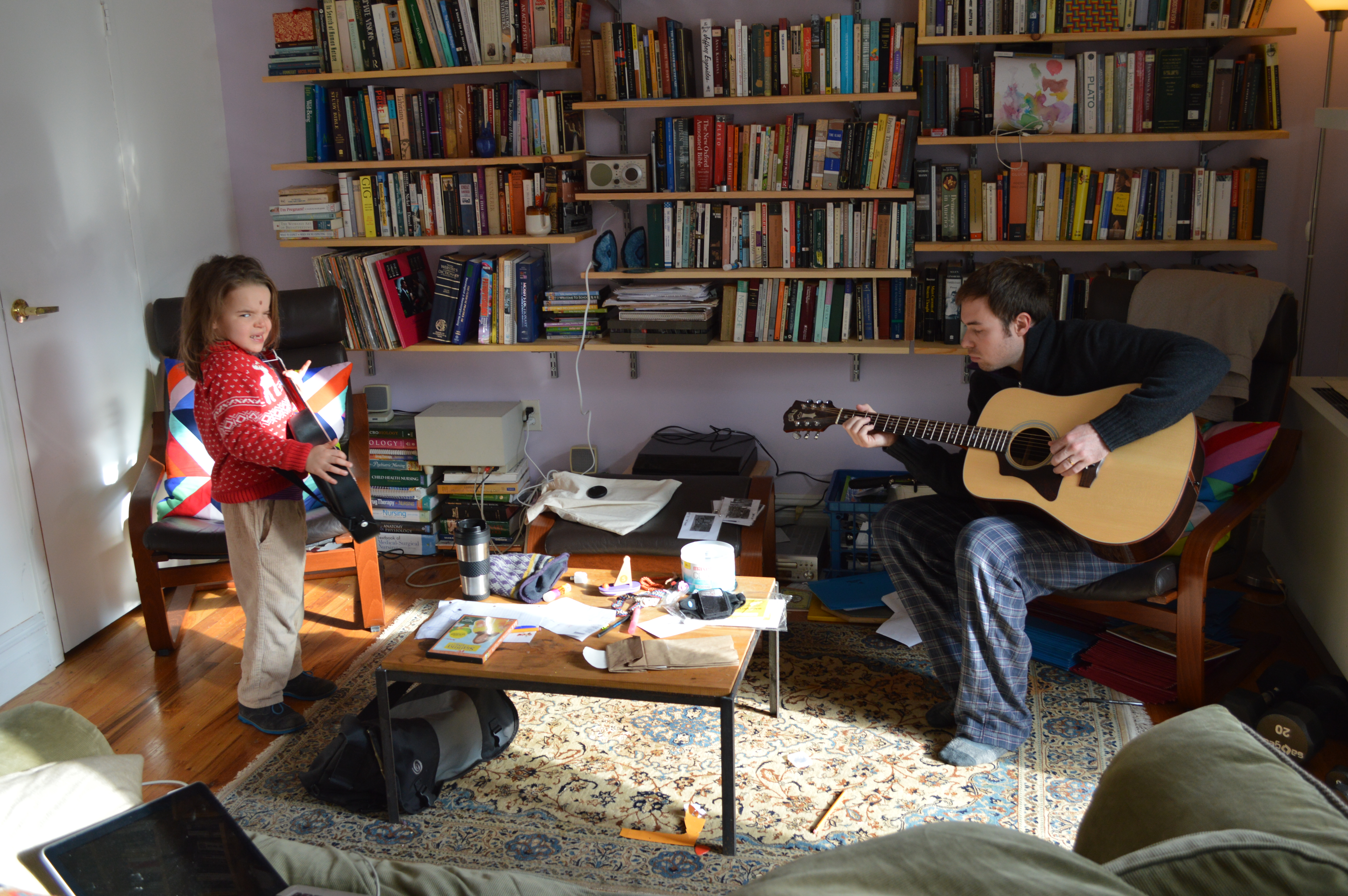 We got up and ate some leftover chicken. Snow was still falling and it was cold. Playground and driving anywhere were out, and I wondered what to do.