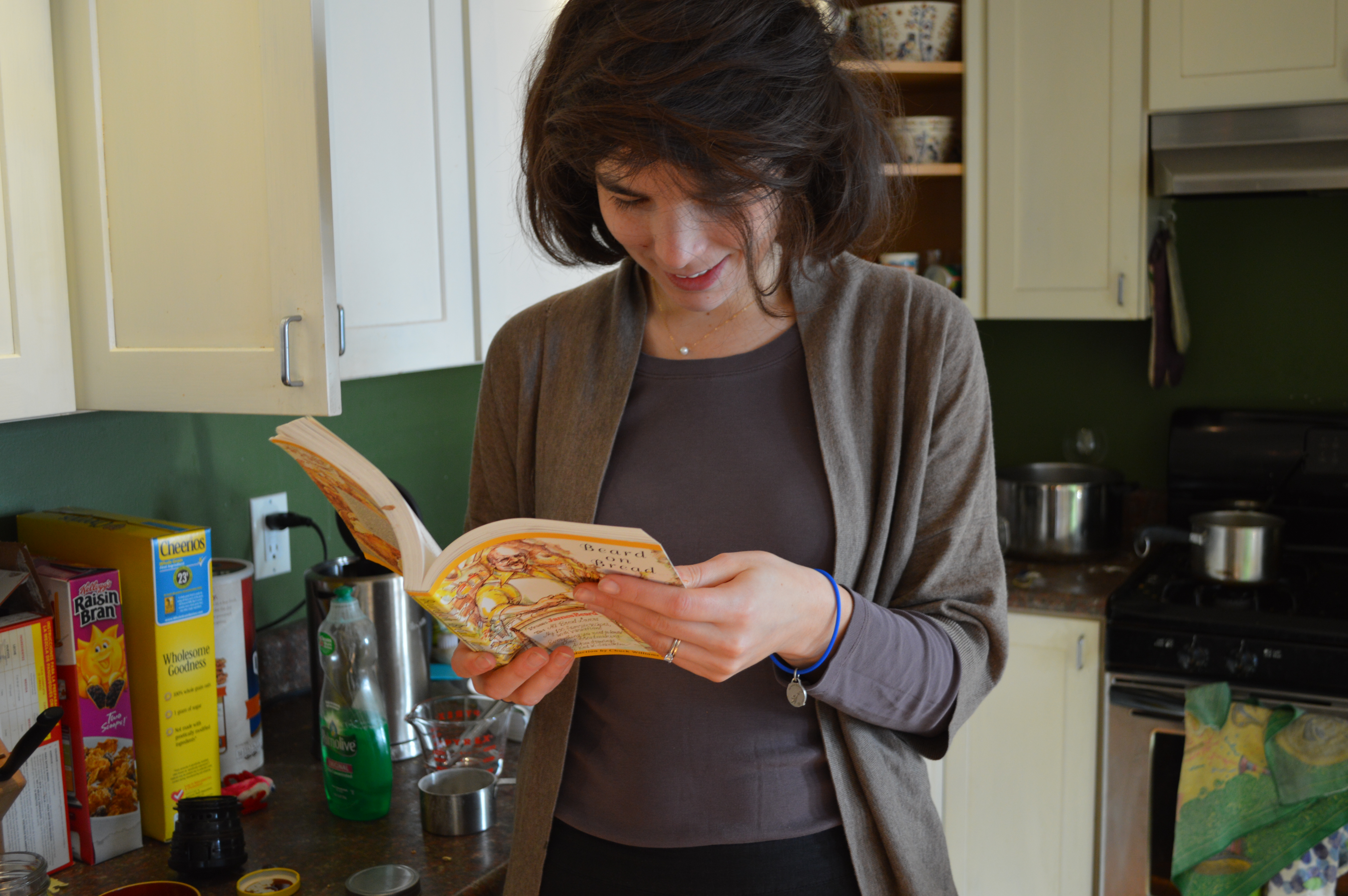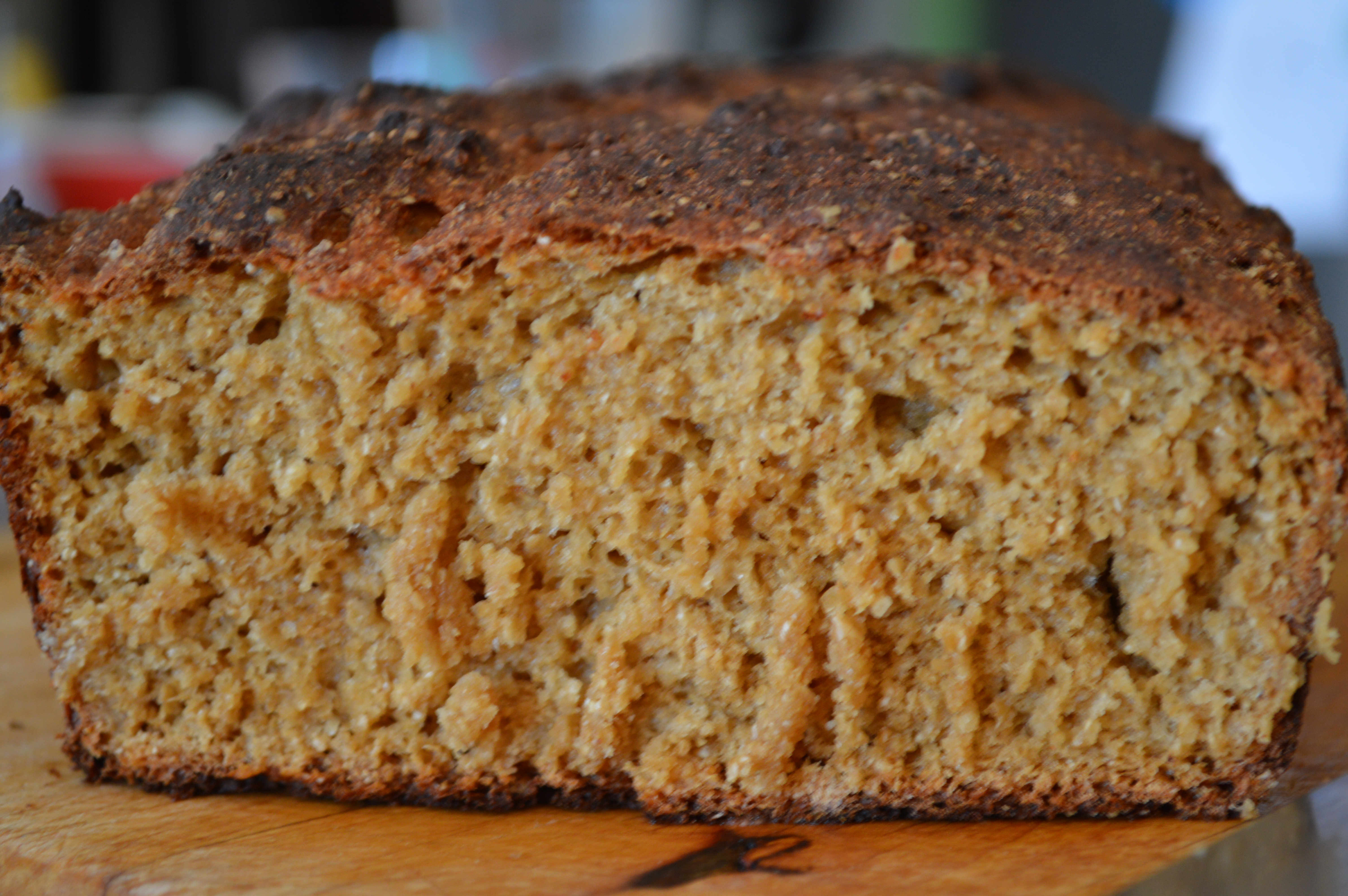 I haven’t made a lot of bread because I lack patience and because I don’t usually make things where measuring and following recipes precisely is actually important, but I would love to become a competent bread baker. This recipe is so easy that it doesn’t even make me feel like I am practicing baking bread when I make it, but it creates an utterly edible loaf. It comes from James Beard‘s book Beard on Bread, which my mother gave me several years ago, and is the first recipe I’ve tried from the book, after leafing through it longingly many times.