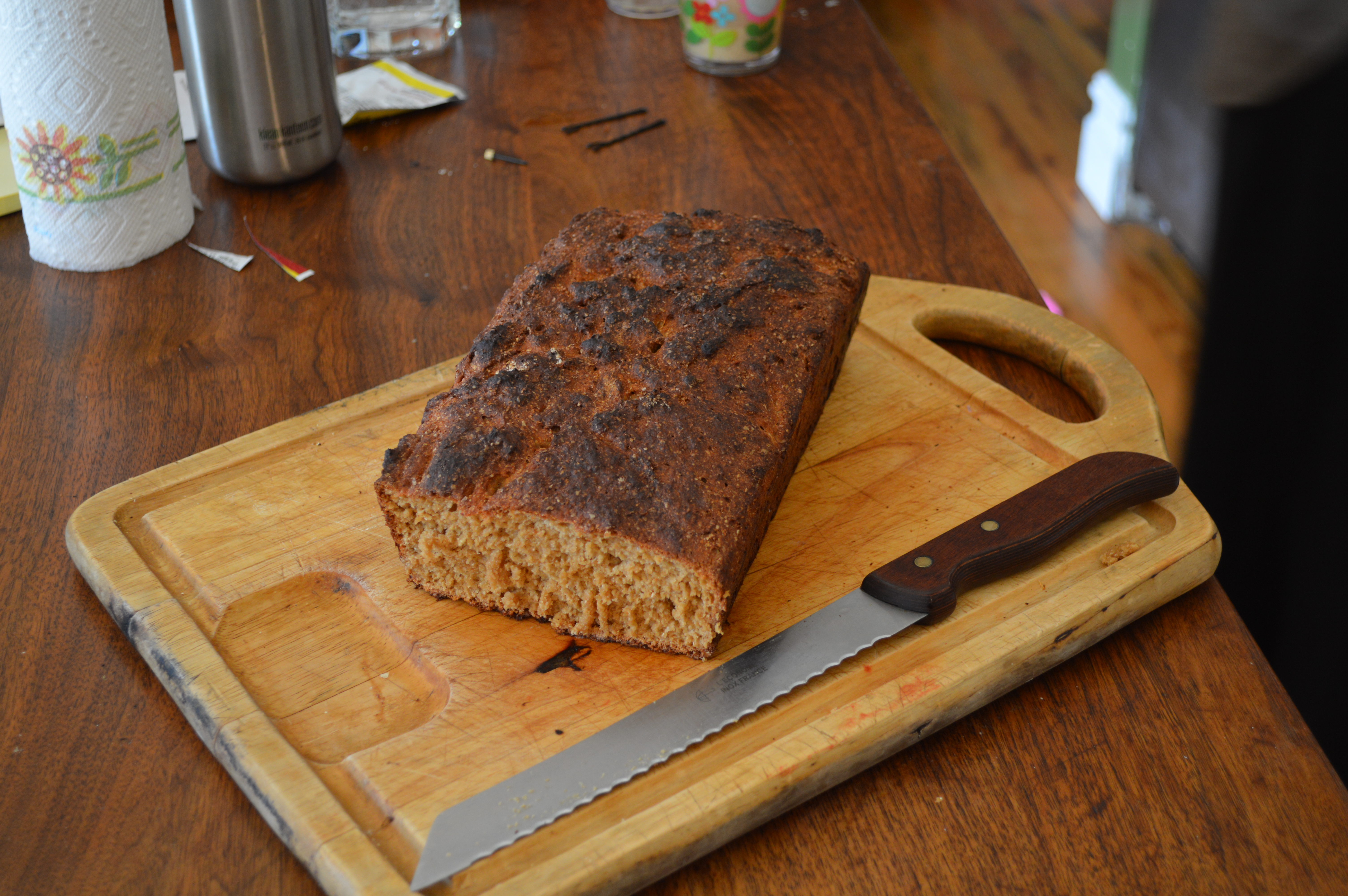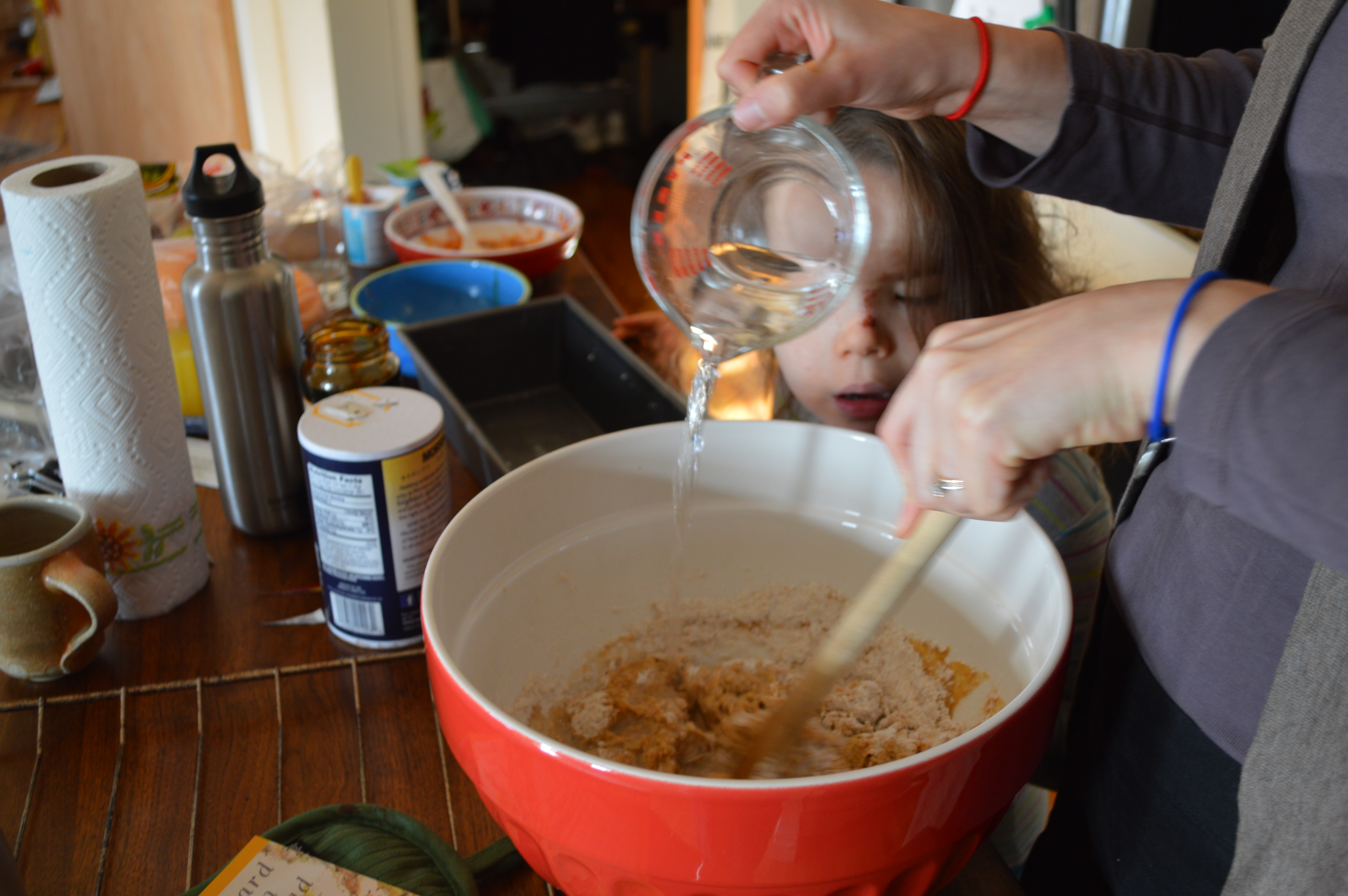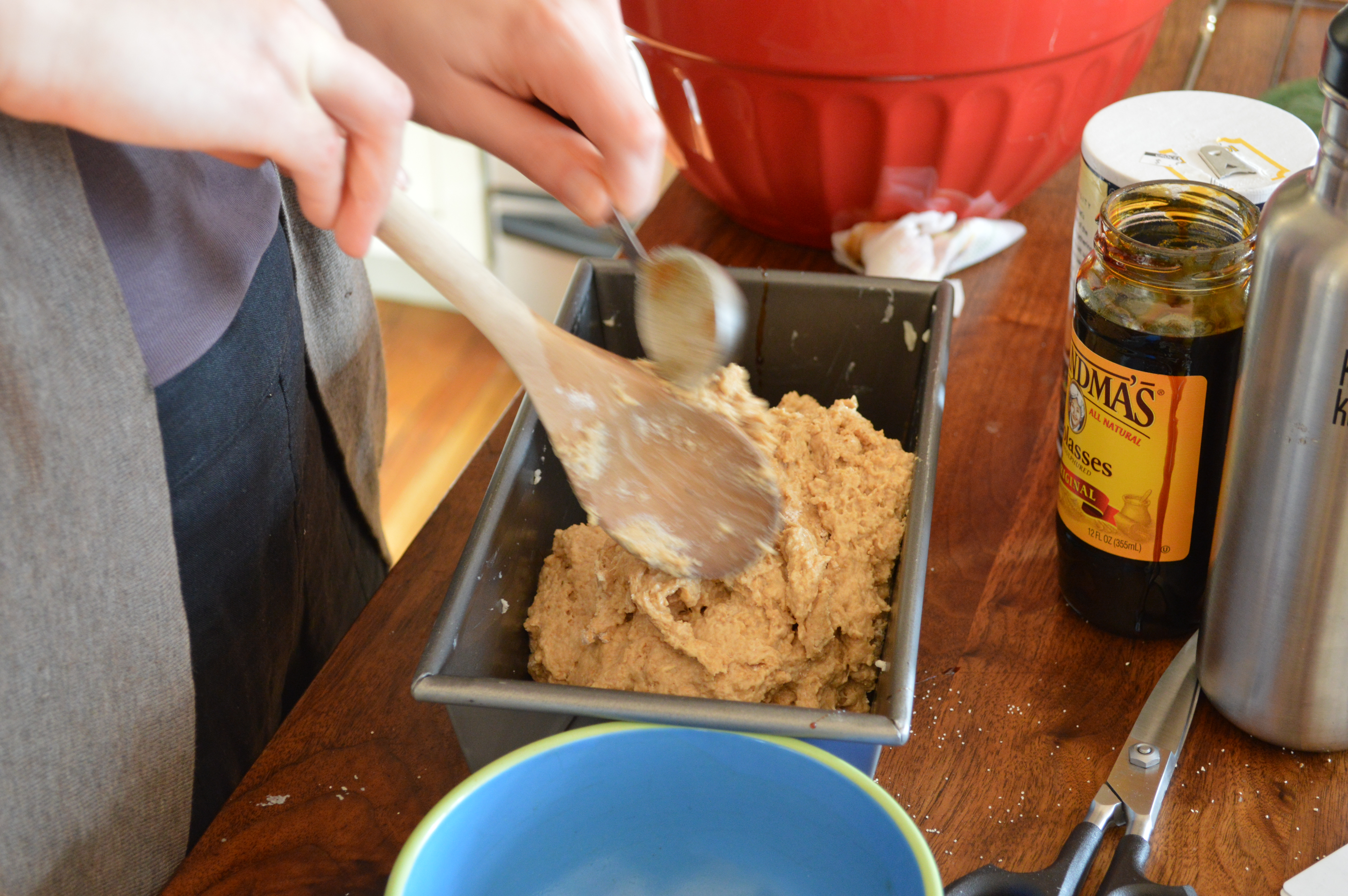 Then add another half cup of water. Now combine the flour, the yeast/molasses/water mixture, and the salt. Add about 1 more cup of warm water, enough to make the dough sticky and wet, and spread it into a buttered 9 x 5 x 3 inch bread loaf tin. Cover with a dishtowel, set it in a warm spot (i.e. on top of the oven) and allow it to rise by one-third of its original size.