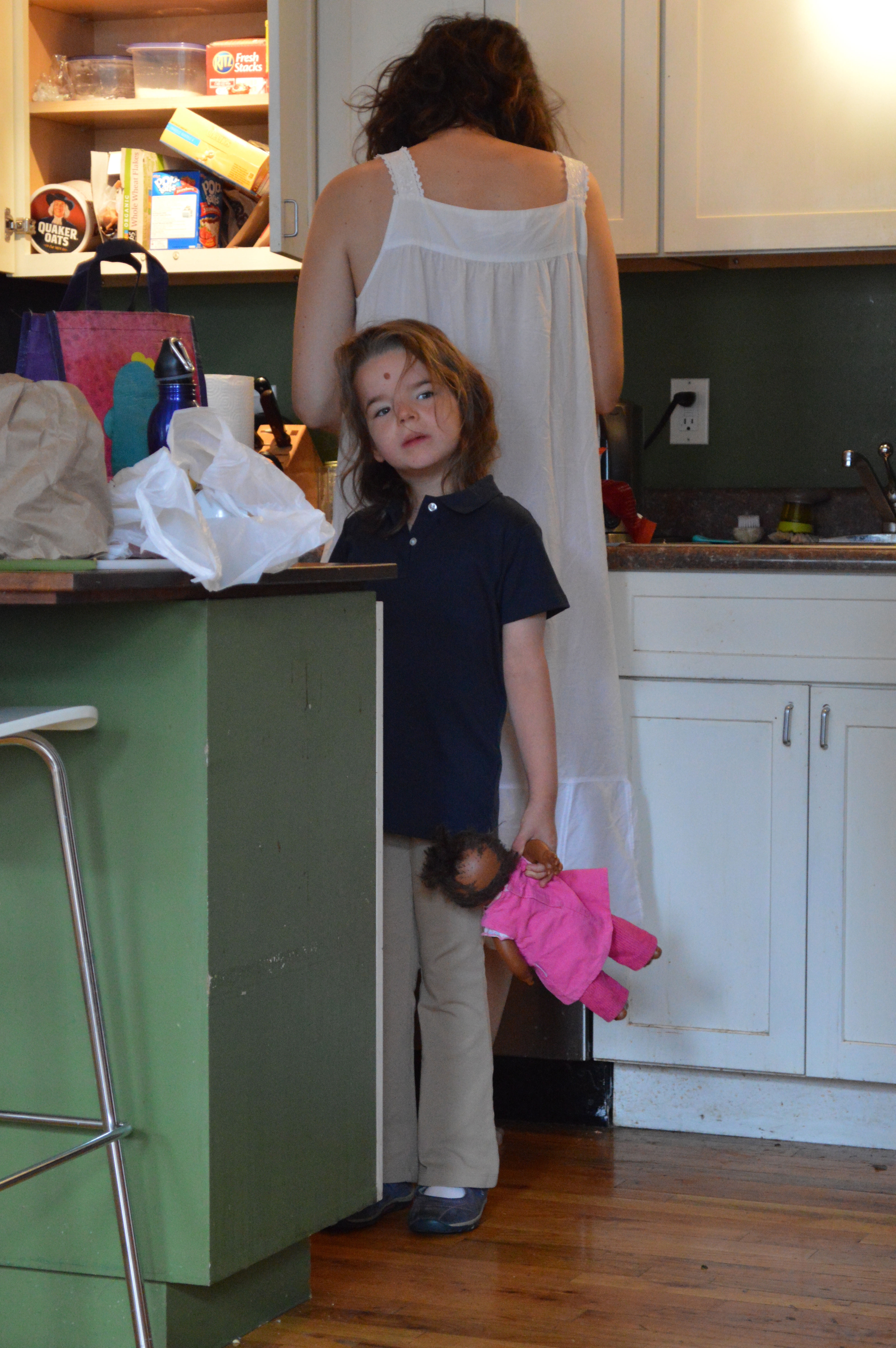 We got off to a good start — it was one of those mornings when she refused to pee before we left, and then I threw up on myself (yup!) in the car. Wondering if I could get her to use the bathroom before class started and how much I smelled like barf, I forgot to take the official first day of school photo, but Andrew caught her in uniform before we left home in the morning: